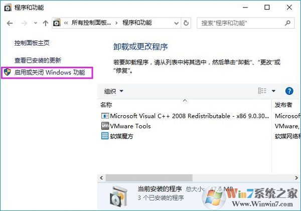 2、在程序和功能窗口,点击左侧“启用或关闭Windows功能”;