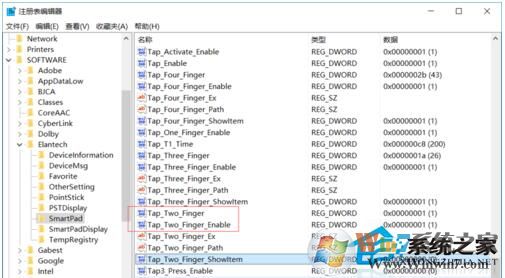 2、在HKEY_CURRENT_USERSOFTWAREElantechSmartPad注册表目录下找到Tab_Two_Finger与Tab_Two_Finger_Enable两项,把其值都改成1,保存;