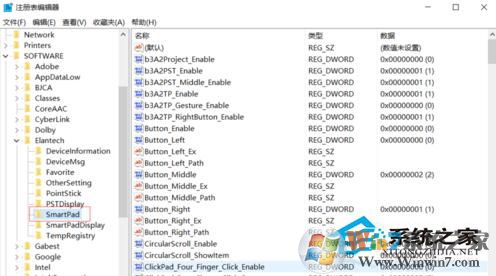 1、在Win10系统中打开注册表编辑器,找到注册表目录项HKEY_CURRENT_USERSOFTWAREElantechSmartPad;