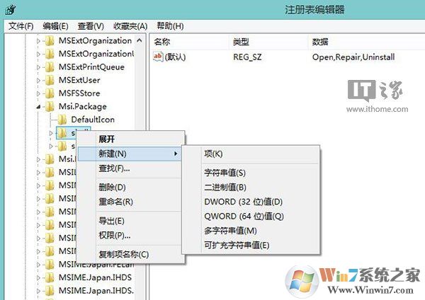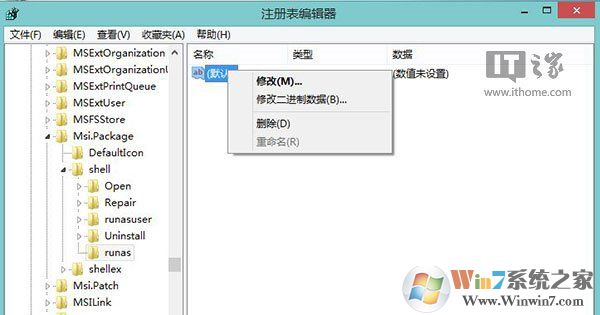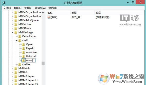 3、定位到HKEY_CLASSES_ROOT\Msi.Package\shell路径,右击shell,新建“runas”项