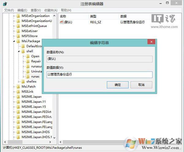 4、在runas项右侧,更改默认字符串,为“以管理员身份运行”值