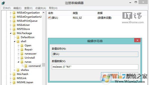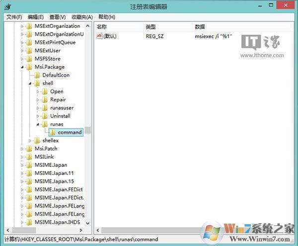 5、在shell下,继续新建“command”项,更改默认字符串为msiexec /i“%1”