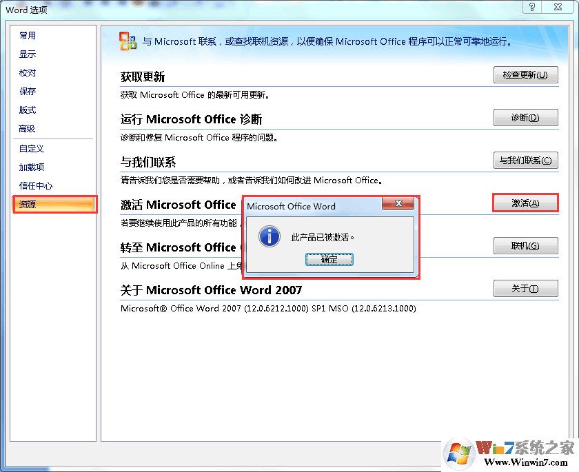 3、进入“Word选项”界面,在左侧菜单找到“资源”(最后一个),接着在右侧的菜单上选择“激活”,系统将会自动提示激活状态,如图: