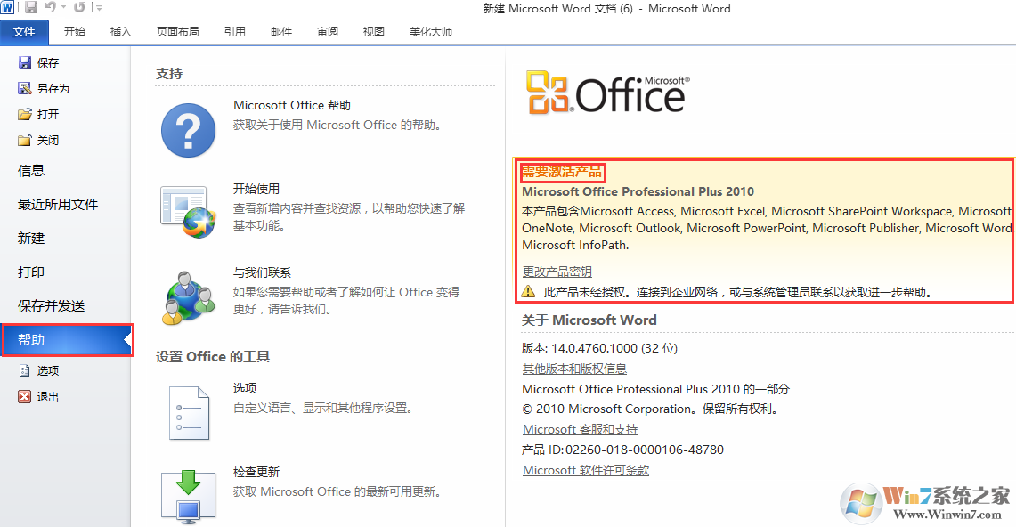 2、在左侧菜单栏选择“帮助”,然后在右侧就会出现一个新的信息菜单,即可看到您的Office是否已经激活,如图: