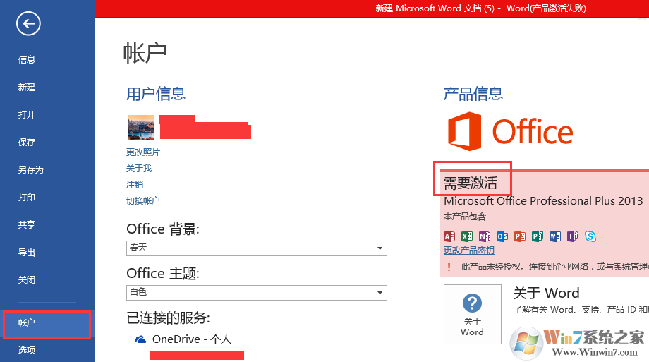 2、选择左侧蓝色菜单中的倒数第二个选项“帐户”,然后在右侧就会出现一个新的信息菜单,就能看到你的office是否已经激活,如图: