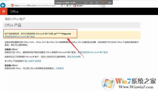 3、如果遇到提示“此产品密钥有效,但它已使用其他Microsoft账户兑换:******@**.com”的提示,则此电脑上的office已经被该邮箱关联,则需要点击“使用你的其他Microsoft账户登录”,然后使用该邮箱(刚刚提示的邮箱)登录。如下图所示: