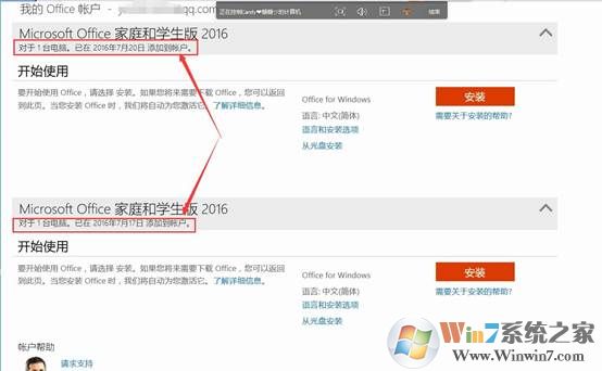2、如果同一账户激活并要关联多个office产品,则登录后,会有版本和激活日期的信息,需要注意区分,然后找到对应的“安装”按钮点击即可。如下图所示: