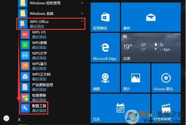 1、点击开始菜单,找到WPS Office,选中WPS Office中的配置工具,如图: