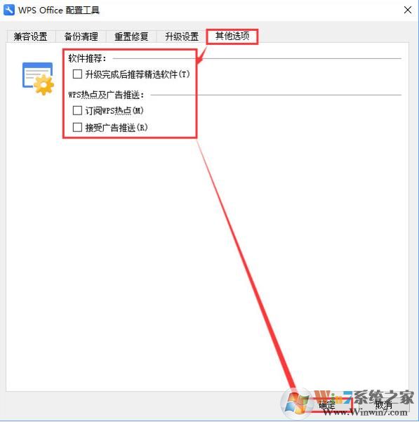 3、打开之后选择“其他选项”——取消前面的“订阅WPS热点”、“接受广告推送”,然后点击【确定】搞定,如下图: