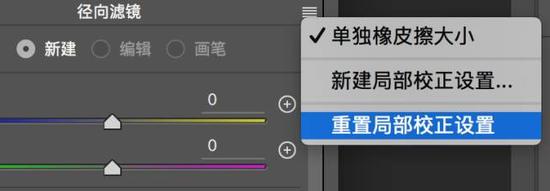现在径向滤镜已经有一些参数,所以我先点击“径向滤镜”字样旁边的菜单,选择“重置局部校正参数”,这时候所有参数会回到默认值。