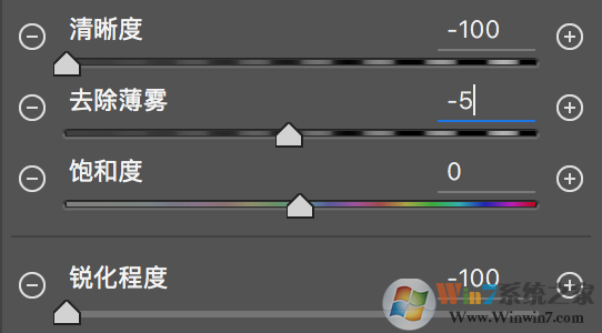 我将清晰度、锐化程度调整为-100,然后把去除薄雾设置为-5,来柔化边缘边缘的照片表现。