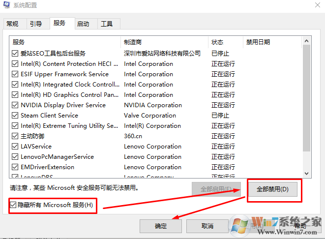 2. 点击服务,勾选隐藏Microsoft服务,点击全部禁用