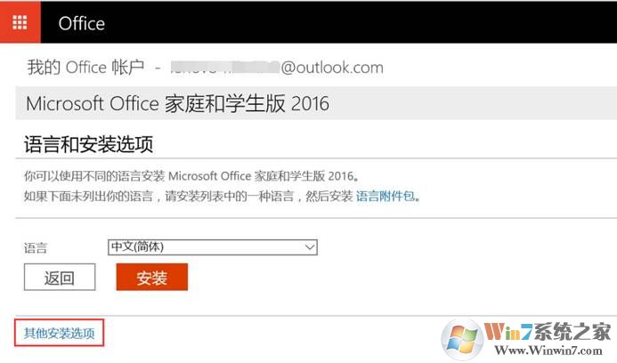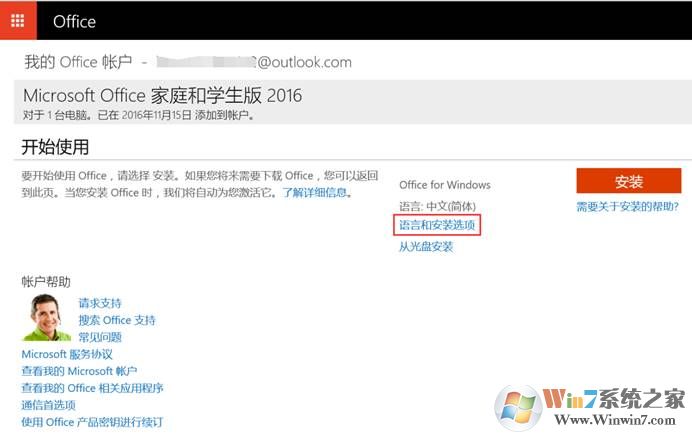 3、在浏览器中打开Office.com网站,使用步骤1中兑换Office密钥的微软帐号登录,可以看到以下界面;点击“语言和安装选项”;