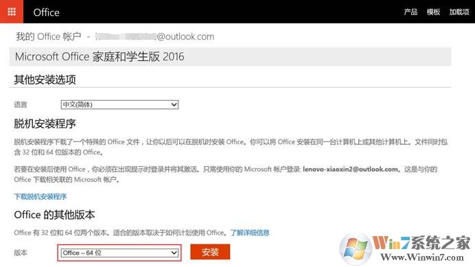 6、在“其他安装选项”界面,点击下拉菜单,选择“Office-64位”,点击“安装”,然后按屏幕提示正常操作即可。