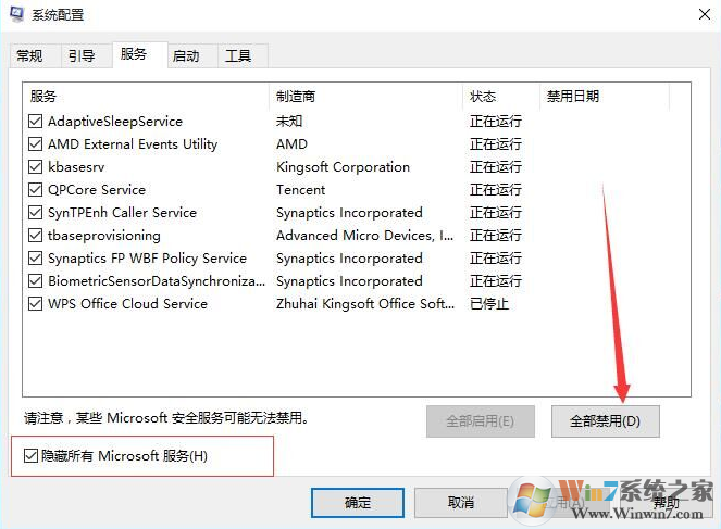 2、点击“服务”标签卡,勾选“隐藏所有的微软服务”然后点击“全部禁用”;