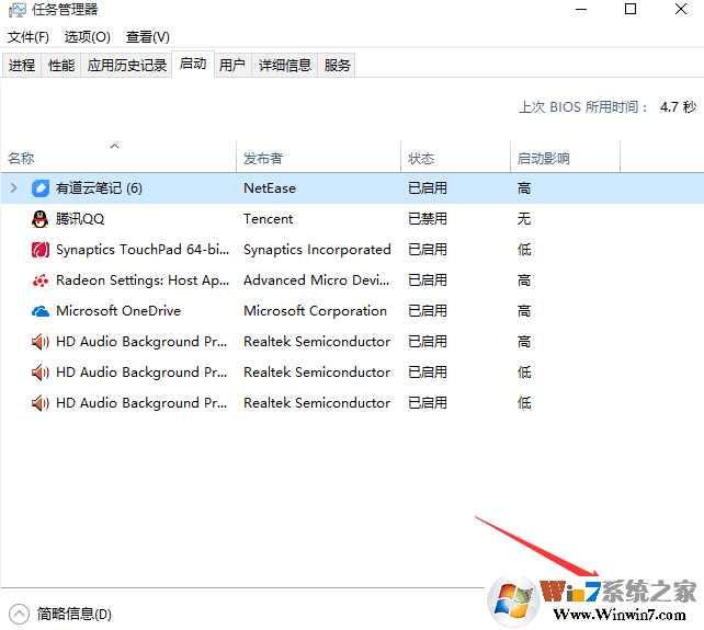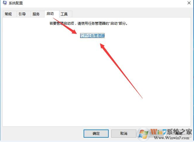 3、点击‘启动’标签卡,点击‘打开任务管理器’,禁用全部启动项;