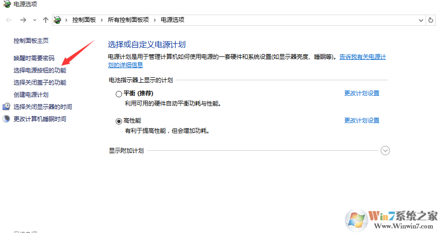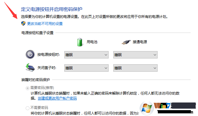 2、点击‘选择电源按钮的功能’,点击“更改当前不可用的设置”;