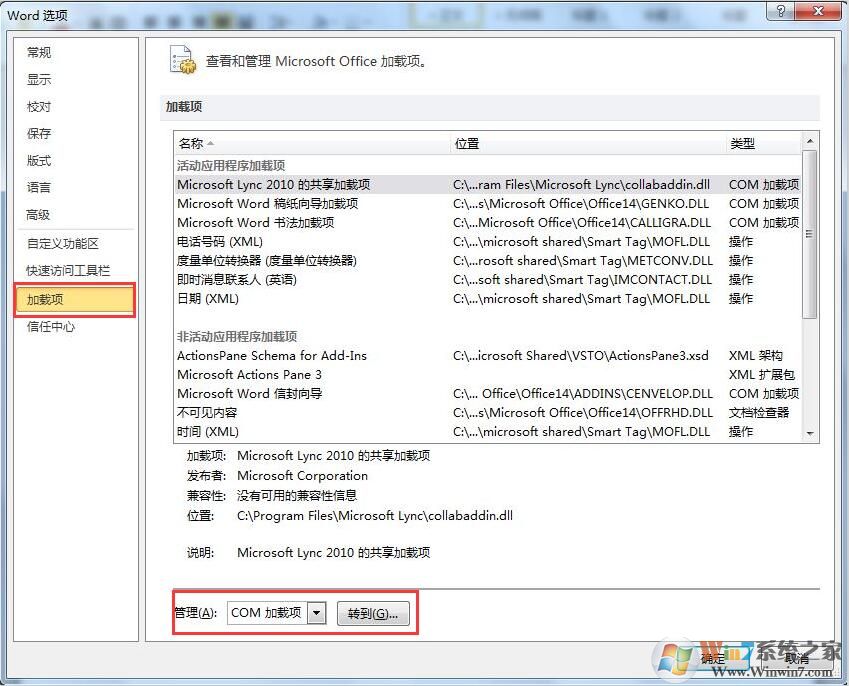 2、选择加载项-管理"COM加载项"后面的“转到”按钮;