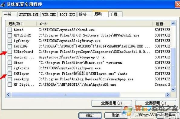 2、然后在开始——运行——输入msconfig,在启动项里取消所有与搜狗搜狐有关的启动前面的对勾。