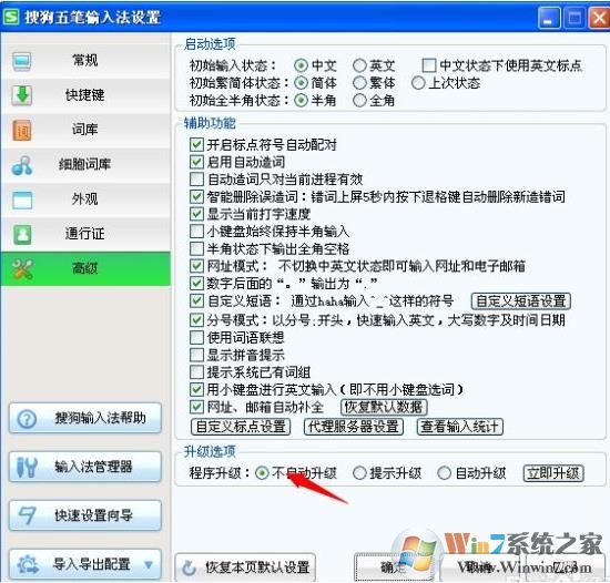 3、再把搜狗拼音输入法和搜狗五笔输入法的自动升级都关闭,免得关闭了别的,一升级又出来了。