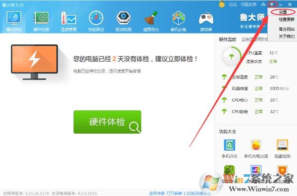 1、首先我们打开鲁大师,然后在右上角找到向下的箭头,然后点击设置选项;