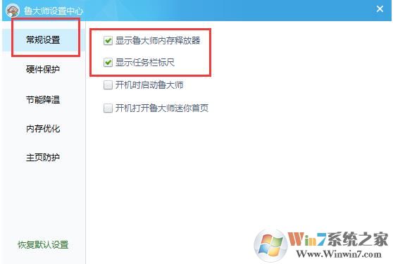2、接着在常规设置中将“显示鲁大师内存释放器”和“现实任务栏标尺”前边的对勾打上就可以了。