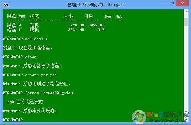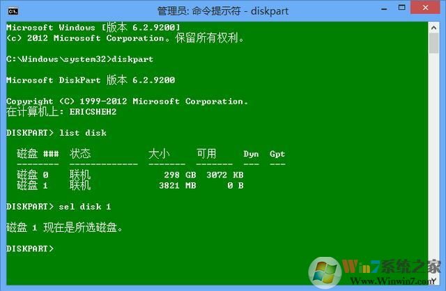2. 执行 diskpart, 以及 list disk,找到你的U盘的编号(本例中是1),然后通过 select disk 1 选中该磁盘;