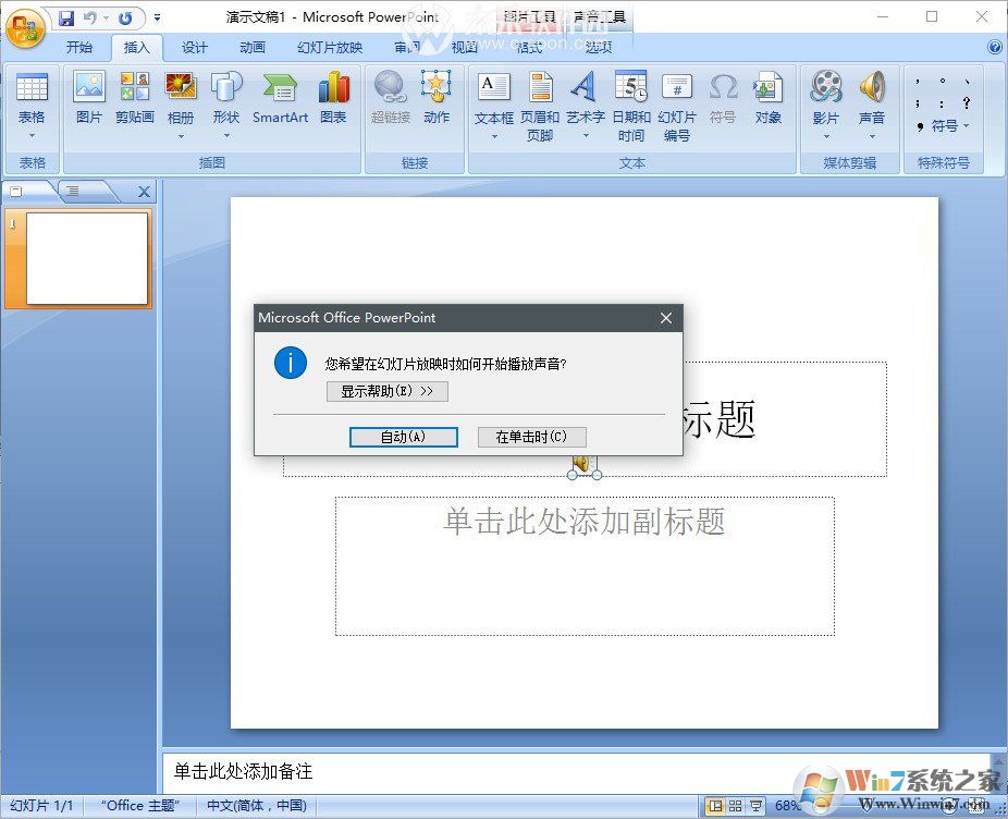 3、这时系统会弹出对话框询问“您希望在幻灯片播放时如何开始播放声音“单击“自动”以便显示幻灯片时就开始播放音乐,此时幻灯片上会出现一个“喇叭”图标