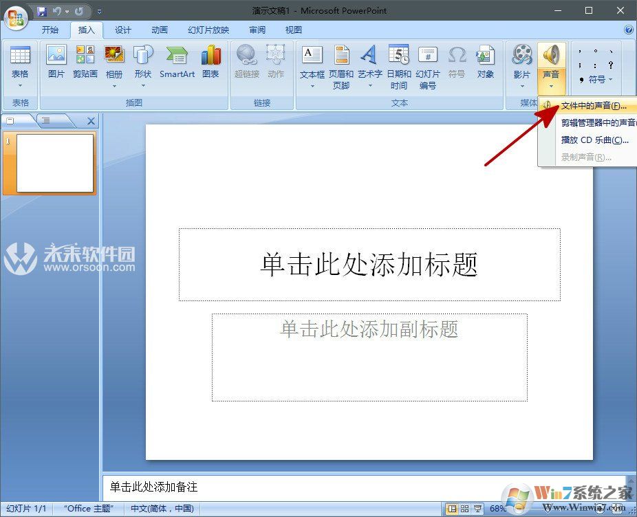 2、在插入选项卡内点击【声音】->【文件中的声音】,插入准备好的声音文件,一般格式为MP3或WAV等 MP3大家可以去网上下载。也可以自己制作或者录音~