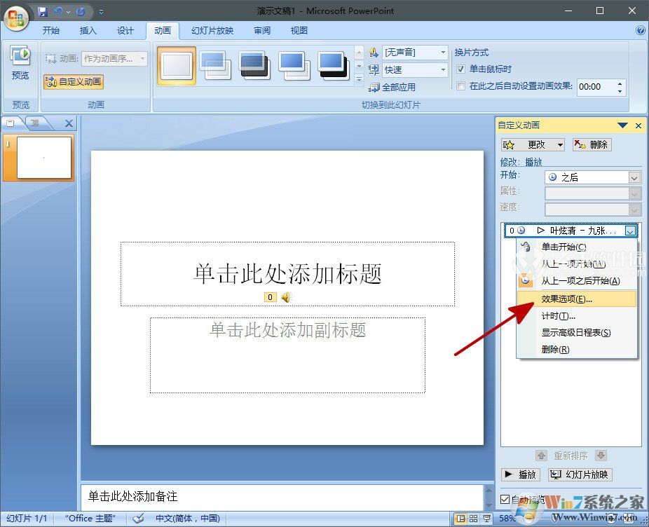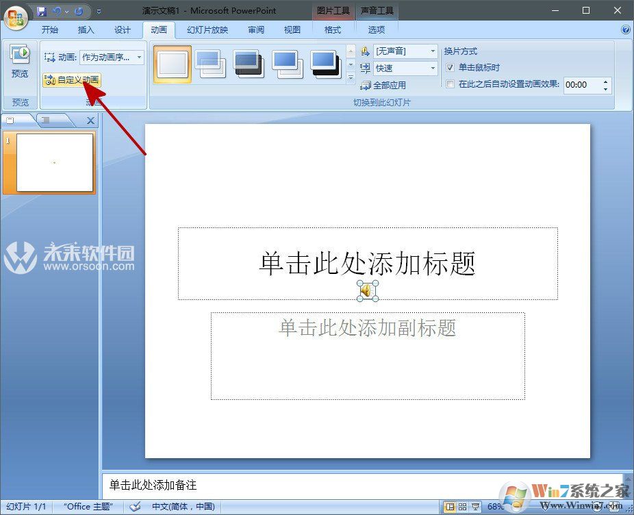 4、接着再单击菜单栏的”动画选项“选择”自定义动画“