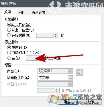 7、在打开的窗口内设置开始时间和停止时间我们设置的是全程背景音乐,所以在停止播放选项内的输入框内输入幻灯片的总数,单击”确定“;