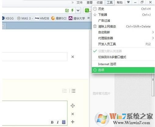 1、以360浏览器为例,进入360安全浏览器后,点击上方菜单栏的“工具”打开菜单,选择“选项”;