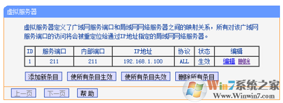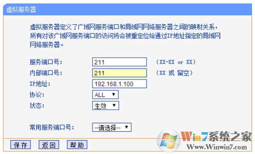 2、“服务端口号”填写:211——>“内部端口号”填写:211——>“IP地址”填写:192.168.1.100——>点击“保存”。