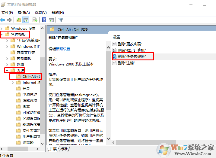 2、在左侧依次展开【用户配置—管理模板—系统—Ctrl+Alt+Del选项】;