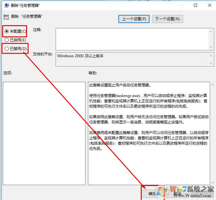 3、在右侧双击打开【删除“任务管理器”】,选择【未配置】,点击【应用】—【确定】即可。