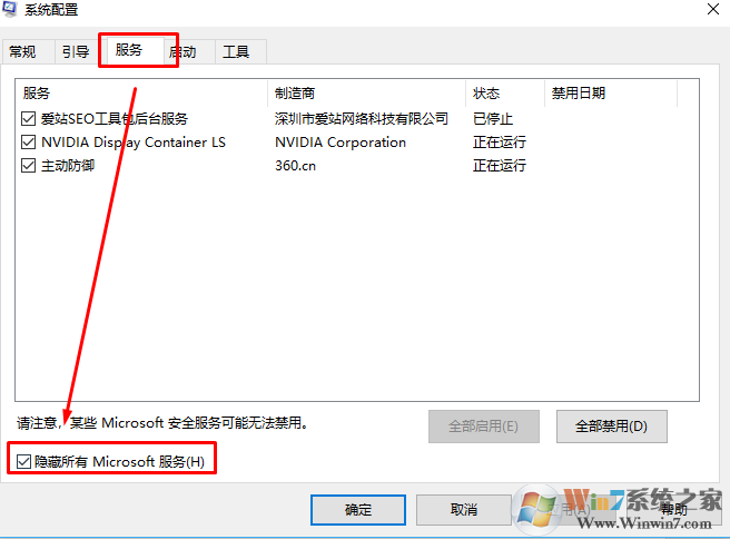 2.点击”服务”标签卡,选择”隐藏所有的微软服务”,然后点击全部禁用。