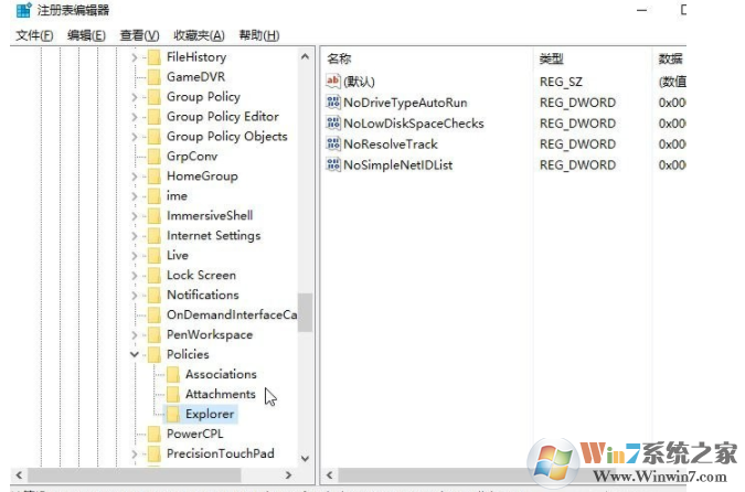 2、在注册表中依次展开:HKEY_CURRENT_USER\SOFTWARE\Microsoft\Windows\CurrentVersion\Policies\Explorer ;