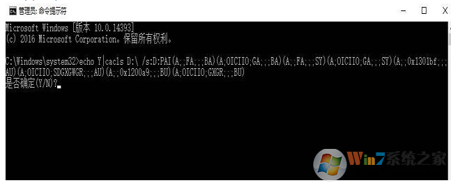 2、在命令提示符中输入:echo Y|cacls D:\ /s:D:PAIAI(A;;FA;;;BA)(A;OICIIO;GA;;;BA)(A;;FA;;;SY)(A;OICIIO;GA;;;SY)(A;;0x1301bf;;;AU)(A;OICIIO;SDGXGWGR;;;AU)(A;;0x1200a9;;;BU)(A;OICIIO;GXGR;;;BU) 按下回车键;