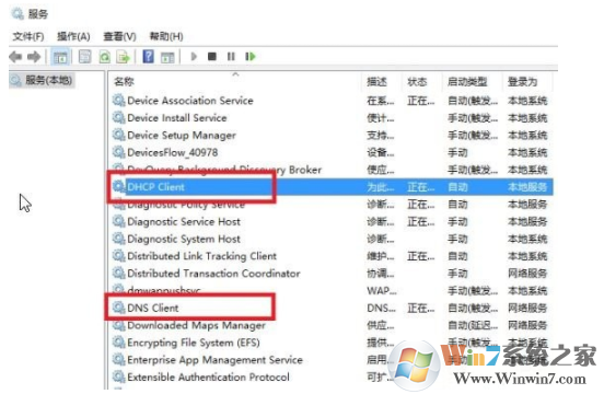 2、在服务列表右侧找到“DHCP Client”和“DNS Client”这两项,双击打开 检查下它们的启动类型是否为“自动” ,若不是将其修改为“自动”,然后点【应用】-【启动】-【确定】即可;
