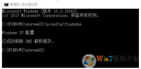 4、在命令提示符中输入:ipconfig/flushdns 按下回车键,等待提示“已成功刷新缓存”即可解决不能上网的问题了!