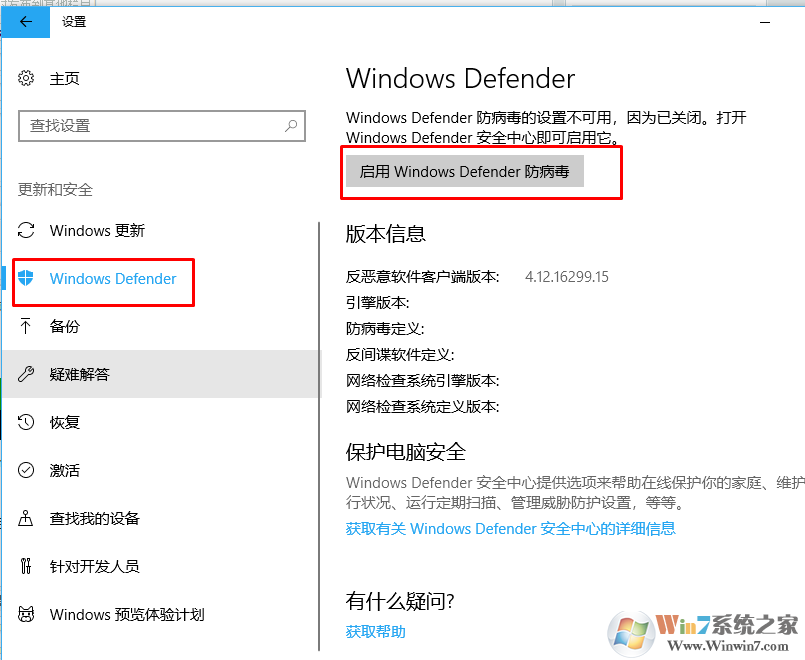 2、设置---更新和安全---点击启用windows defender。