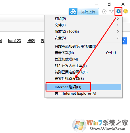 1、打开IE浏览器→在右上角点击【工具】→ 【Internet 选项】;