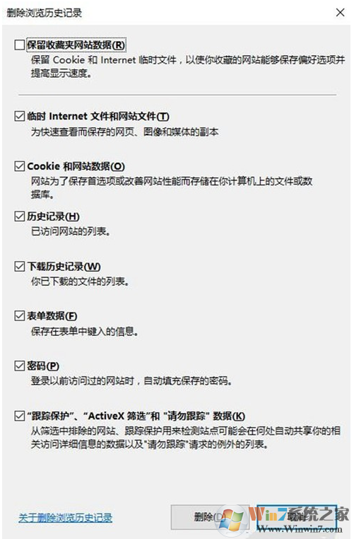 3、将所有选项(不包含“保留收藏夹网站数据”),点击【删除】 ,然后点击确定便会自动清理。