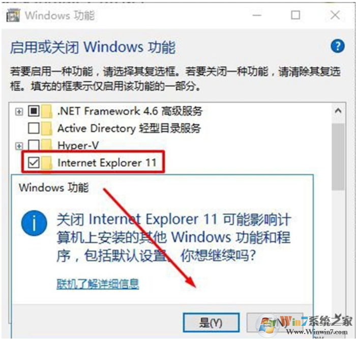3、将【internet Explorer 11】的勾去掉,在弹出的提示框中点击【确定】- 【确定】,耐心等待后系统便会将ie卸载;