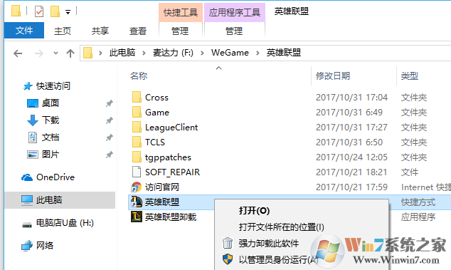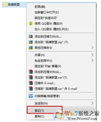 1、如英雄联盟,我们可以在安装路径中找到英雄联盟文件夹,单击右键,选择【剪切】,必须是要在游戏未运行的情况下操作;