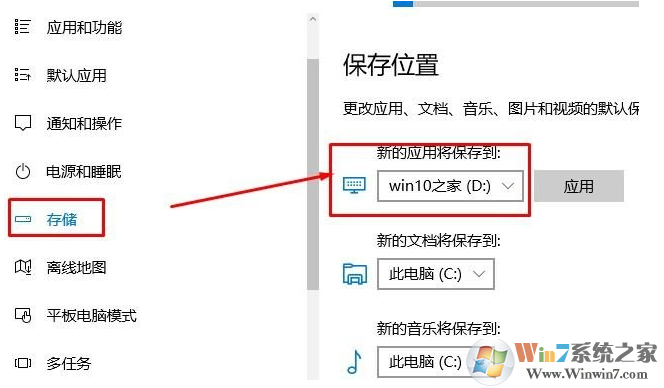2、在左侧点击【存储】,在右侧将新的应用将保存到下拉菜单中选择其他磁盘,然后点击【应用】确定