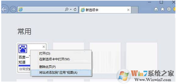 2、这是会弹出我们经常使用的一些网站,我们在对应网页窗口中单击右键,选择【将站点添加到“应用”视图】;