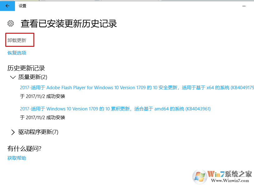 - 选择查看更新历史记录,然后单击卸载更新链接。