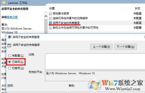 17、在右侧打开【启用不安全的来宾登录】选项,点击 【已启用】,点击【应用】--【确定】保存设置!