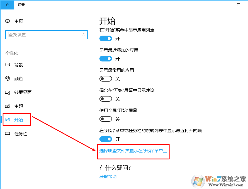 3、在开始选项下找到将哪些文件显示在开始菜单上。